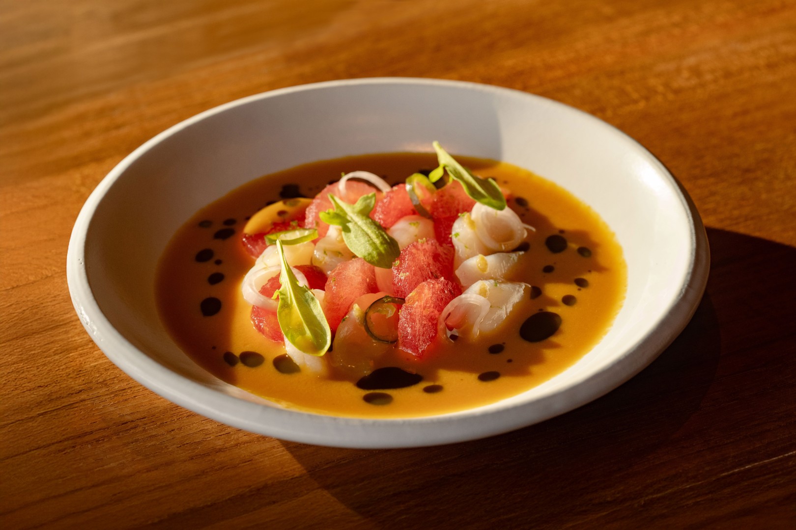 Many dishes incorporate curing methods to enhance flavour while maintaining freshness. One example is the Giant River Prawn, which combines charcoal-grilled prawn with tom yum relish, prawn dumpling, and a butter-based bisque infused with herbs. Another dish, Hokkaido Scallop, draws from the Indonesian dish mangut, reinterpreted through thinly sliced scallops, compressed watermelon, and a spiced coconut broth finished with burnt scallion oil.