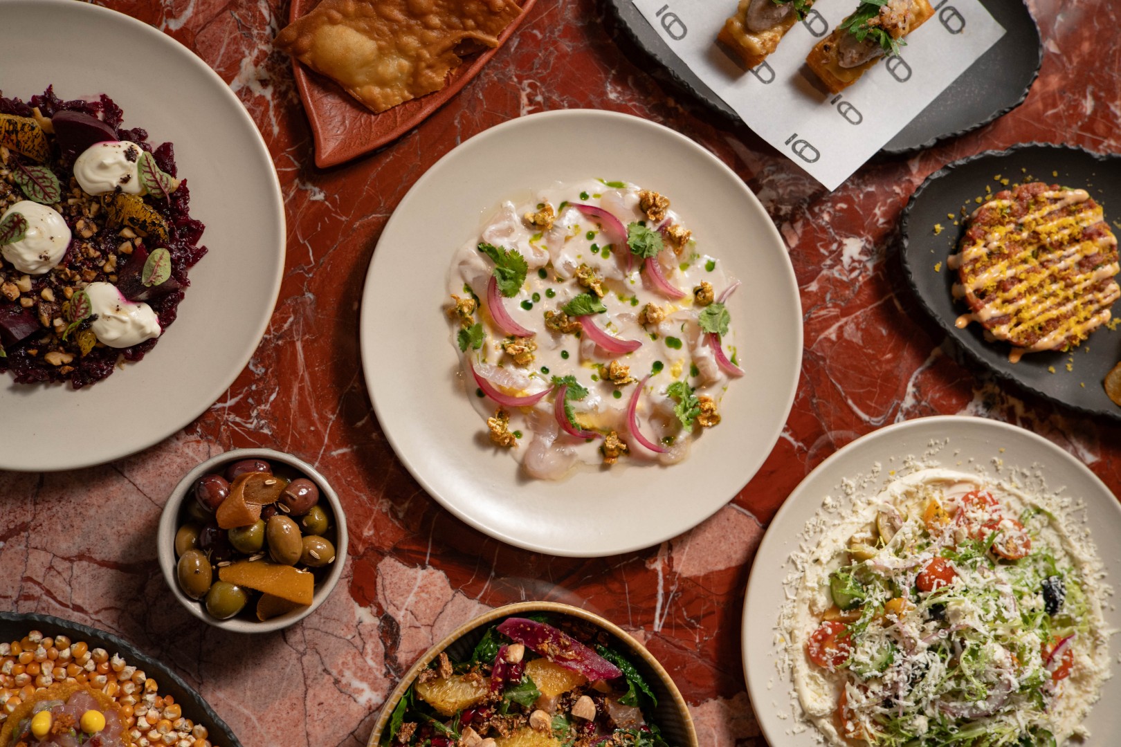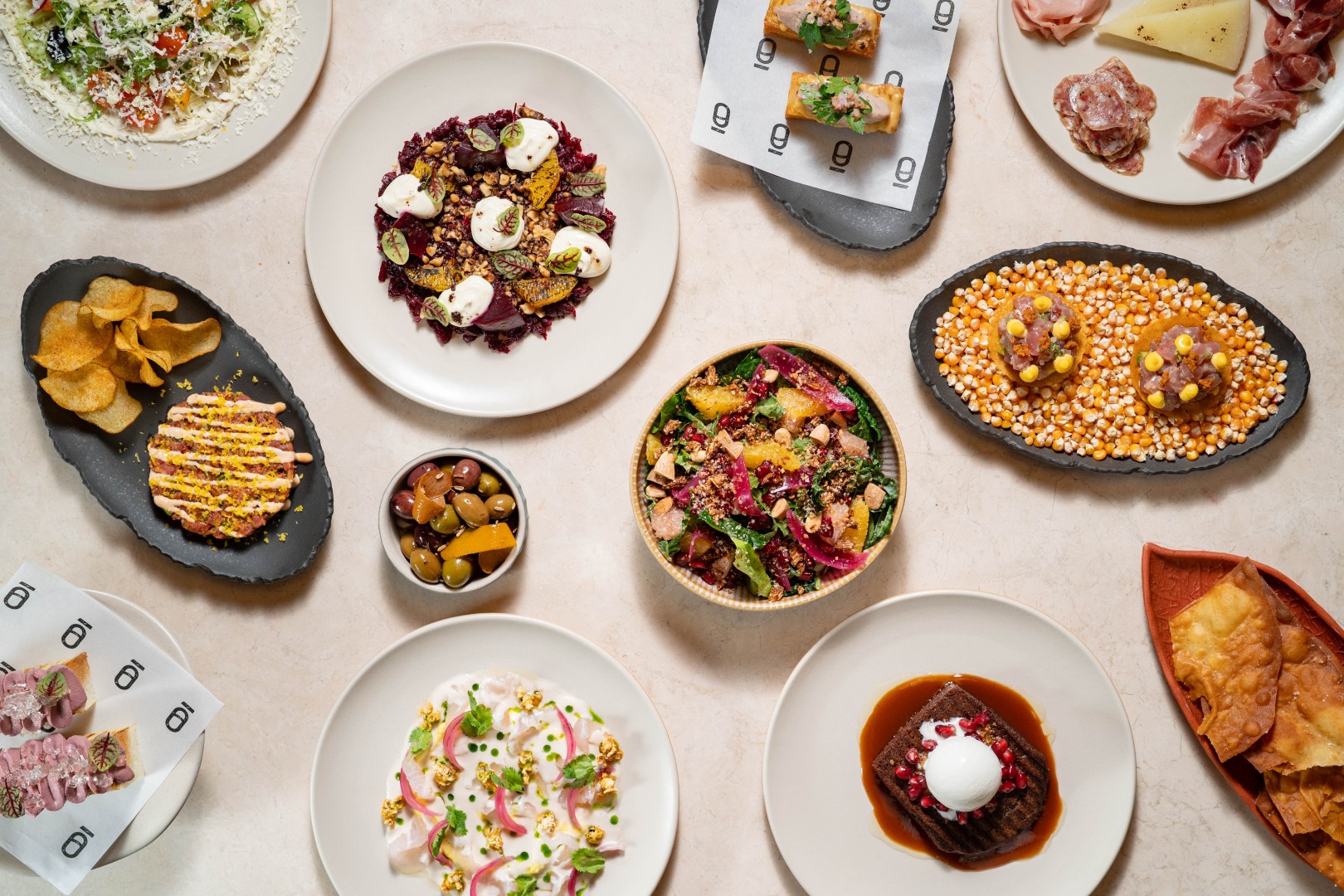 The updated menu draws from a range of Mediterranean cuisines, incorporating elements from Greek, Italian, and Middle Eastern cooking. Dishes include a Greek salad with cucumber, tomato, and feta mousse, as well as beetroot paired with orange and almond. Italian influences appear in dishes such as rigatoni with spicy vodka sauce and confit duck, alongside a wagyu beef cheek lasagna.
